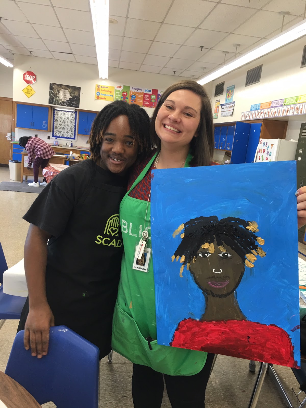 SPREADING JOY AT JOHNSON! Is the title of an Arts for All art inclusion art award for Johnson Traditional Middle School. The first day included time with an art class of 32 8th grade students and then the rest of the day was spent with discovery students in their classroom. The students enjoyed this project of creating self portraits using acrylic paint. We began with an oval for the face and mixing our very own skin colors using 4 colors...pink, yellow, brown, and white. We also chose a background color and a shirt color. One of my great joys was working alongside my daughter, Dala Sparks, Speech Therapist. It was so wonderful to meet and teach her students!